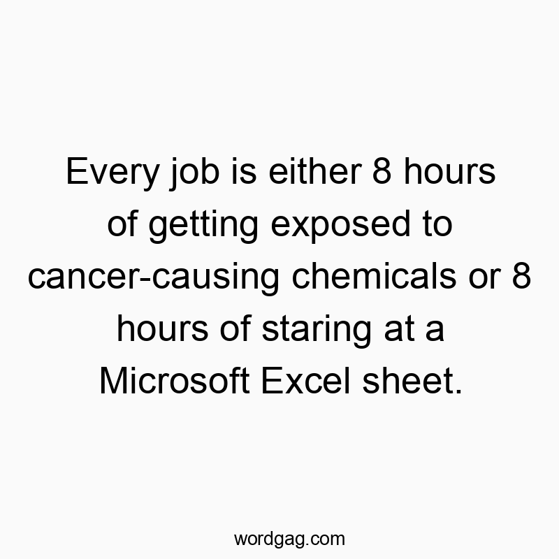 Every job is either 8 hours of getting exposed to cancer-causing chemicals or 8 hours of staring at a Microsoft Excel sheet. Posted on1 month ago1 month ago by slickboy in Funny Quotes 💾 Save Image Commentary:Looks like we're all just one spreadsheet error away from becoming a math magician or a chemist! 🤹♂️🔬📊 Related Funny Posts 🤝 Sometimes you show up to work, and they just torture you for hours. Why is judge the only job where you can bang a little hammer to make people shut up? I’ve needed that in literally every job I’ve had. Every morning when that damn alarm clock goes off, I just feel it so much: A million-dollar inheritance suits me much better than an office job. Getting paid to sleep would be such a dream job. This whole “having a job” thing is really getting in the way of me having my best life.