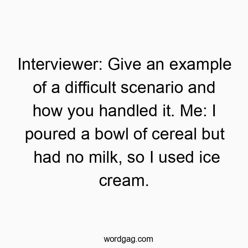 Interviewer: Give an example of a difficult scenario and how you handled it. Me: I poured a bowl of cereal but had no milk, so I used ice cream.
