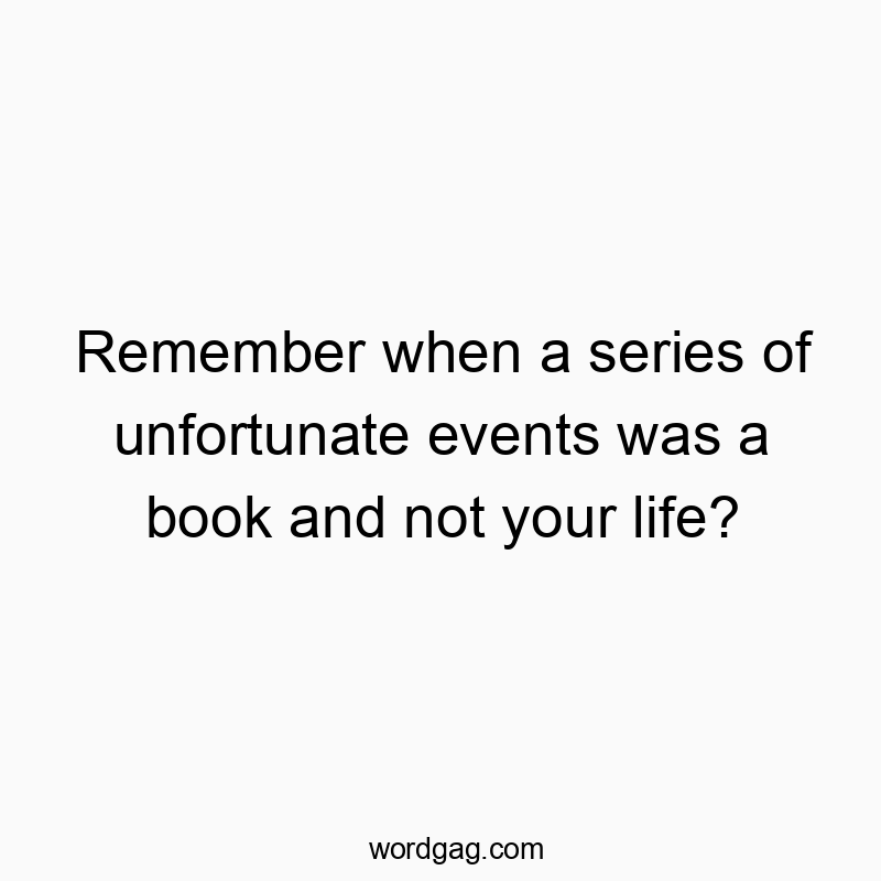 Remember when a series of unfortunate events was a book and not your life? Posted on6 days ago6 days ago by slickboy in Funny Quotes 💾 Save Image Commentary:When did my life get optioned for a sequel? ππ Related Funny Posts π€ Life is just a series of obstacles preventing you from reading your book. Life is just a series of Sopranos references with some other things mixed in. Life is pretty much just a series of awkward and embarrassing moments, separated by snacks. Due to unfortunate circumstances, things are no longer fergalicious nor bootylicious. My greatest joy in life is when a friend reads a book I recommend. My greatest frustration in life is when they donβt read it fast enough.