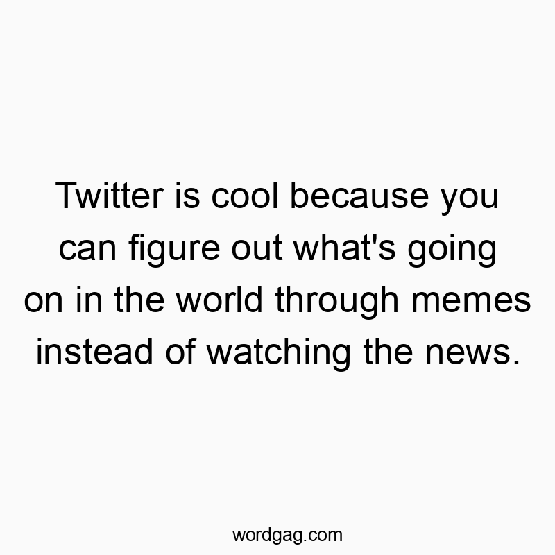 Twitter is cool because you can figure out what’s going on in the world through memes instead of watching the news. Posted on1 month ago1 month ago by slickboy in Funny Quotes 💾 Save Image Commentary:Why watch the news when you can get all your worldly wisdom from a dancing cat gif? π±β¨ #Priorities Related Funny Posts π€ The cool thing about Twitter is you’re never the craziest one. A Twitter swear jar could end world hunger. A swear jar for Twitter would end world hunger. If you see me online, I’m not chatting. I’m busy ignoring the world and laughing at memes like it’s therapy. Memes are the most information-dense form of communication.