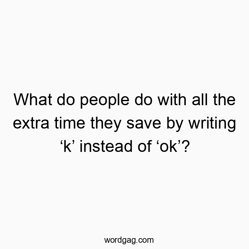 "Seriously! 🤔 Do they use it to meticulously arrange their sock drawers, contemplate the mysteries of the universe, or perhaps master the art of the perfect cup of tea? ☕️ The possibilities are endless when you're living life in the fast lane of 'k'! 😄 #TimeSavers"